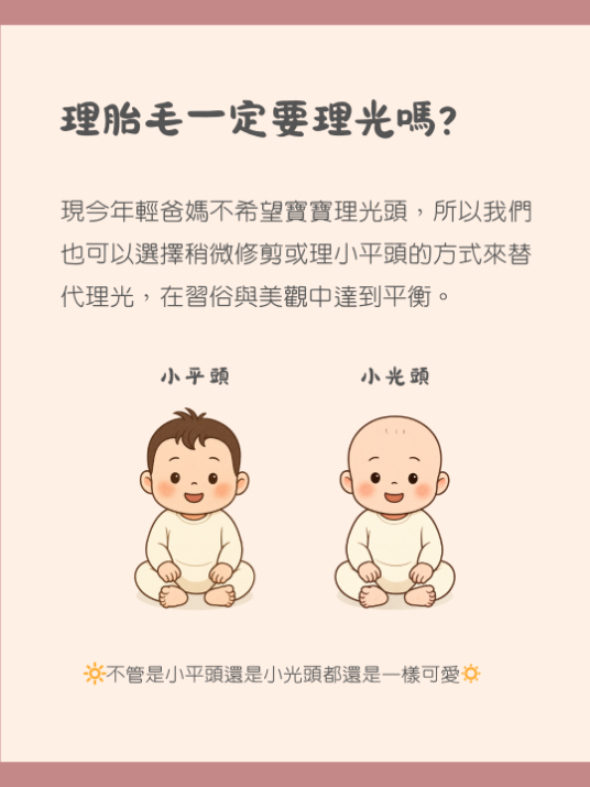 大部分寶寶不會理光,會保留一些頭髮,當天也可以再與師傅討論調整唷!
