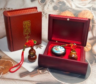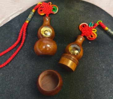 材料採用紫檀木.用手工製做成葫蘆造型. 葫蘆的諧音是「福祿」,福就是福氣、福運、幸福的意思,祿就是代表著高官爵位的意思。