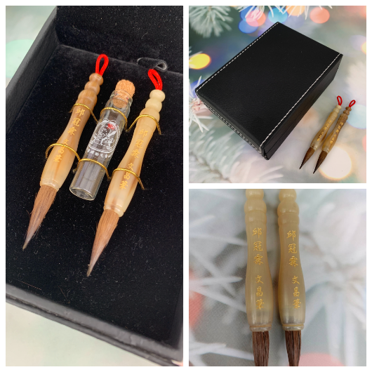 上下赤牛角中間黑檀木相接而成,筆桿底部設計像『鬱金香』花的照型,以細膩的純手工雕塑而成。鬱金香花語:愛、慈善、名譽、美麗、祝福、永恆,胎毛製作成毛筆,給予孩子永恆的祝福!