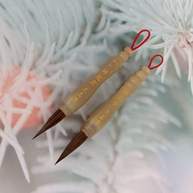 上下赤牛角中間黑檀木相接而成,筆桿底部設計像『鬱金香』花的照型,以細膩的純手工雕塑而成。鬱金香花語:愛、慈善、名譽、美麗、祝福、永恆,胎毛製作成毛筆,給予孩子永恆的祝福!